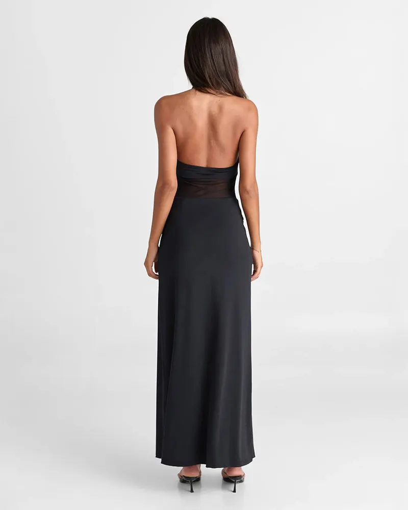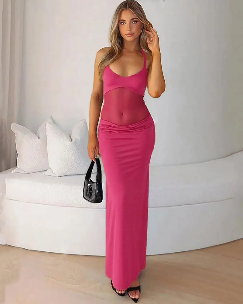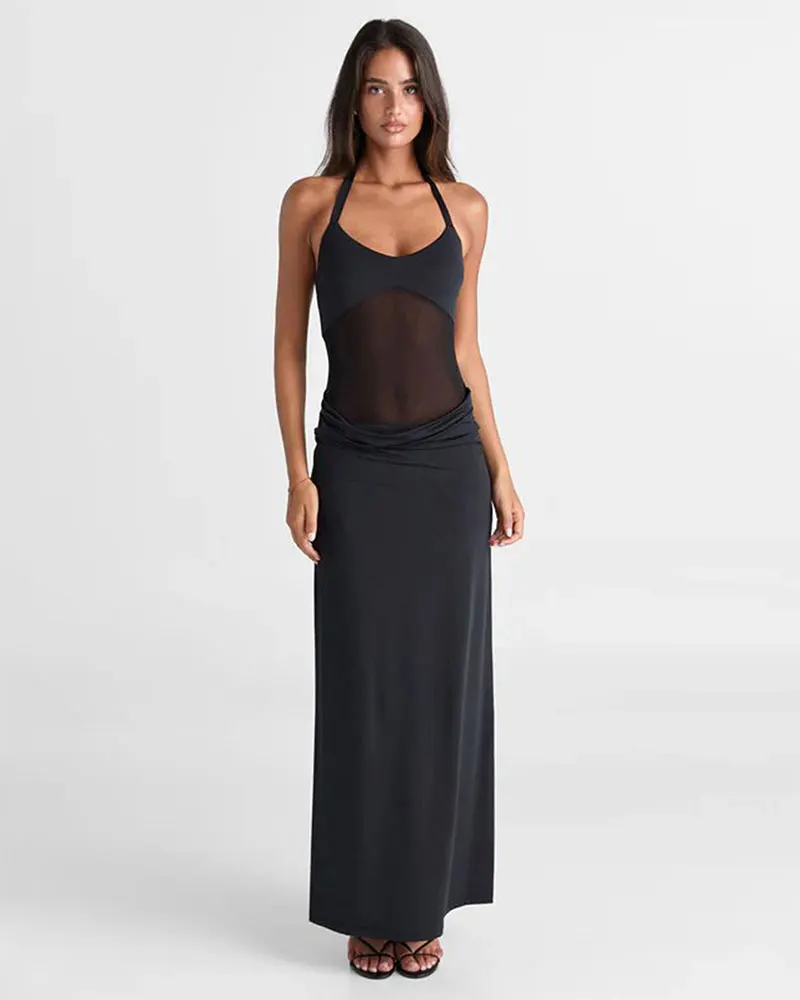 Halter Backless Sexy Maxi Dress for Women Summer Gown Mesh Patchwork Sleeveless High Waist Slim Elegant Long Dress
